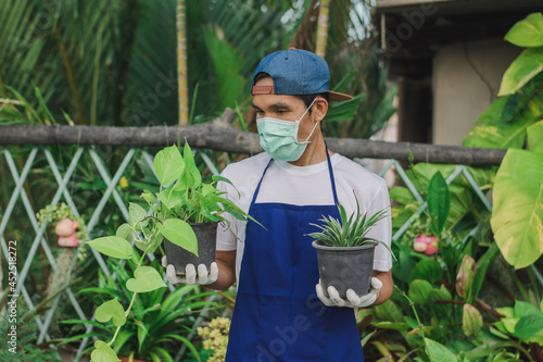 prevent, face mask, mask, ornamental plant, farmer, organic, fresh, small business, garden center, entrepreneur, spring, gardener, floral, work, background, person, plant, job, young, flower, portrait, owner, man, apron, botany, gardening, shop, male, greenhouse, men at work, florist, horticulture, happy, caucasian, occupation, garden, people, store, nature, business, green, pot, agriculture, summer, retail