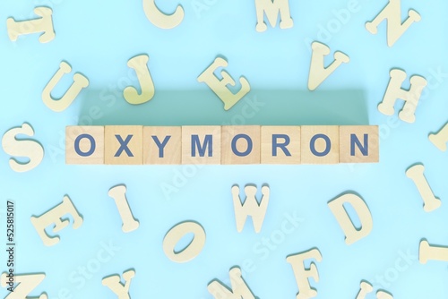Oxymoron figure of speech concept in English grammar class lesson. Wooden blocks typography flat lay in blue background.