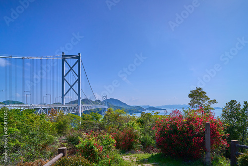 広島県尾道市のしまなみ海道の大浜PA展望台から因島大橋方面を見る