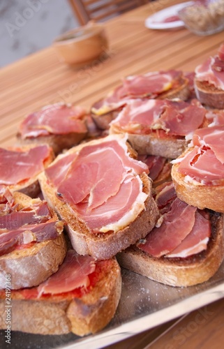bread, tomatoes, ham, serrano, cocktail, knock, toast, tradition, speciality, catalan, catalan, spanish, spanish, spain, slice, slice, grilled, grilled, grilled, garlic, oil, olive, olive oil, kitchen, gastronomy, pork butcher, dish, meal