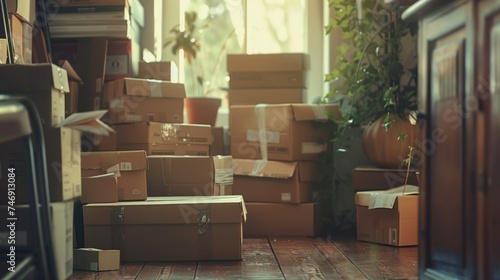 Packed Moving Boxes in Home Interior. A room filled with various sized cardboard boxes, capturing the process of moving or the arrival of many parcels, highlighted by natural light.