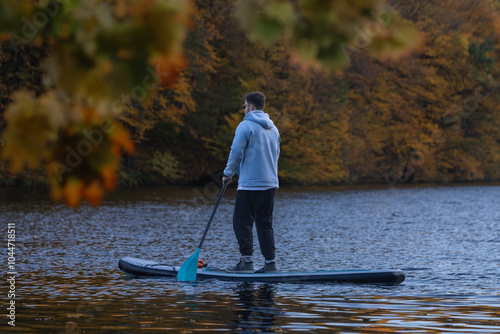 man, autumn, lake, paddling, paddle, sup, board, swimming, floating, balance, calmness, chilling, chill, relax, recreation, water, leisure, outdoors, fall, 1, oar, river, people, tree, nature, daylight, wood, boatman, watercraft, fun, adult, water sport, relaxation, summer, active, exercise, lifestyle, foliage, calmness, sport