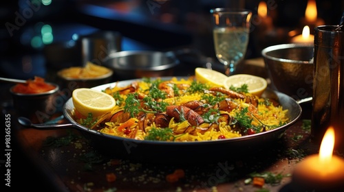 food, meal, dinner, meat, vegetable, plate, dish, wine, eatery, lunch, salad, healthy, cooking, vegetable, cookery, epicure, rice, seafood, pan, fish, white, red, fried, tomatoes, paella