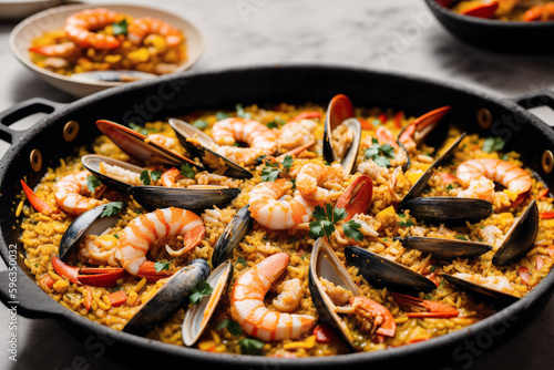 Paella, traditional spanish dish made with rice, Chicken and vegetables, served in a pan. Paella with seafood. Spanish cuisine. Generative AI