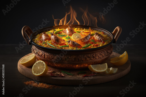 paella, food, meat, vegetable, pan, cooking, dish, meal, dinner, vegetable, chicken, rice, hot, cookery, healthy, fried, lunch, onion, seafood, frying, cook, eatery, plate, fish, tomatoes, red, generative, ai