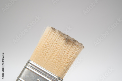 photograph, macro, object, tool, art, craft, paint, brush, bristle, bricolage, equipment, supply, painter, painting, hobby, detail, texture, beige, white, background, isolated, simple, clean, work, construction, renovation, home, improvement, repair, artistic, creative, design, new, used, silver, metal, ferrule, nylon, synthetic, stroke, application, apply, coat, colours, surface, artist, handyman, project