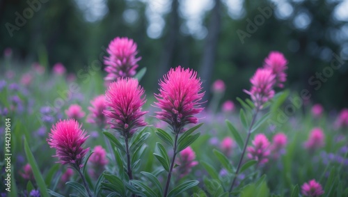 Paintbrush flowers in a wildflower meadow during spring and summer near a hiking trail with tiny pine trees