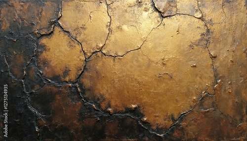 Painted surface of aged metal in gold brown, black colors. Vintage grunge texture. Antique, scratched, textured effect background with cracked patterns. Imperfection, rust eaten abstract design