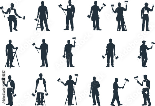 Painter silhouettes, worker painting with roller, man holding paint bucket, construction decorator vector, home renovation, ladder illustration, professional painting job