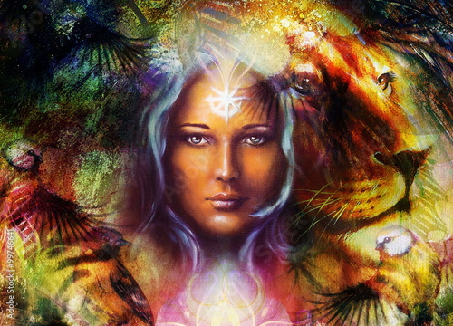 painting mighty lion and tiger head, and mystic woman with ornamental tattoo on face with bird, ornament background and mandala. computer collage, profile portrait, eye contact.