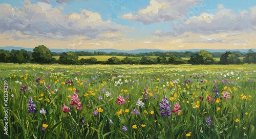 painting, wildflower, meadow, sky, cloud, flowering, growing, blooming, landscape, scenic, art, colourful, green, blue, yellow, pink, purple, white, field, grass, horizon, tree, day, season, spring, summer, rural, countryside, hill, distance, nobody, nature, artwork, idylli, vista, background, calm, fresh, floral