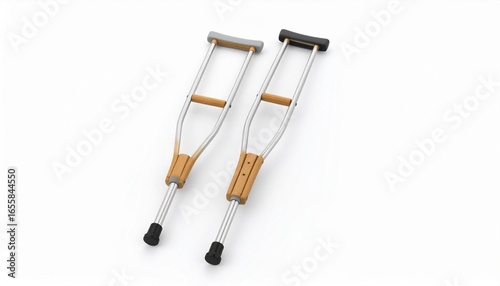 "Pair of aluminum crutches with wooden handles and underarm pads, placed diagonally on a white background