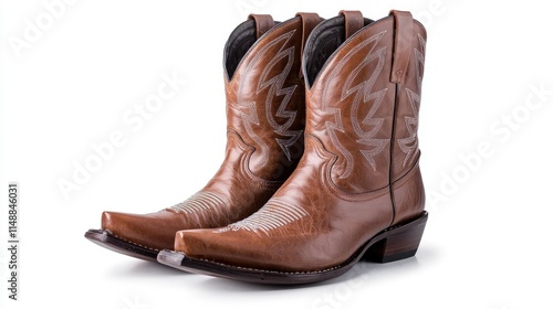Pair of brown leather cowboy boots with intricate stitching, isolated on white background.