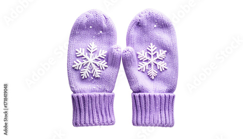 Pair of vibrant purple mittens, adorned with white snowflakes