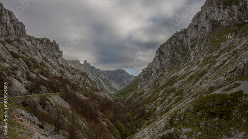 Paisaje espectacular de desfiladero en Picos de Europa bajo un cielo nublado