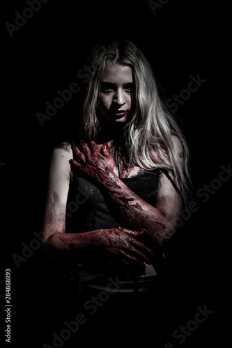female, covered, hand, arm, dark, skinny, girl, shade, young, skittish, mad, face, woman, bleeding, gaunt, bloody, horror, darkness, shadow, painful, gore, grief, cadaver, zombie, madness, black, caucasian, background, force, scarey, blood, horrible, lamp, light, illuminated, underground, touch, hug, oneself, hugs, pain, despair, pale, abhorrence, violence, white, red, agony