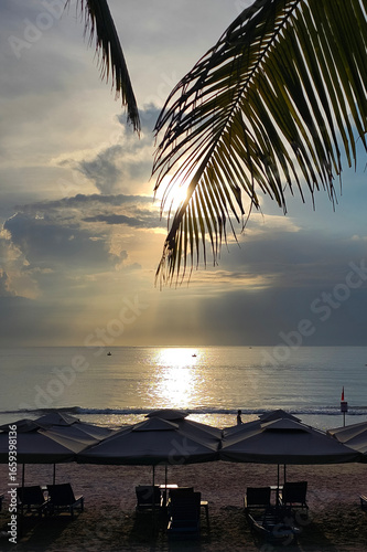 vietnam, beach, sunrise, palm, lounger, umbrella, sea, ocean, sand, travel, tropical, morning, relaxation, coastal, scenic, sky, silhouette, paradise, island, water, nature, sun, landscape, cloud, palm tree, vacation