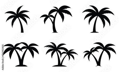 palm, tree, tropical, beach, island, summer, vacation, travel, nature, plant, silhouette, black, vector, icon, graphic, symbol, foliage, leaf, trunk, frond, paradise, holiday, resort, sun, coast, ocean, sea, oasis, desert, exotic, landscape, element, design, modern, minimalist, clean, digital, web, app, print, set, collection, asset, warm, relax, calm, green, growth
