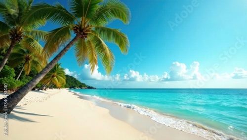 Palm trees sway in ocean breeze with sandy beach, palm, fine art