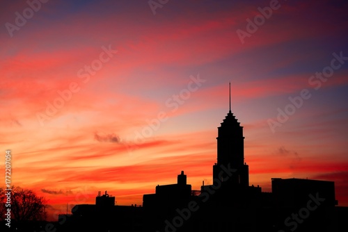 nature, sunset, sky, building, architecture, cloud, landmark, city landscape, silhouette, tower, city, urban, evening, dusk, tower