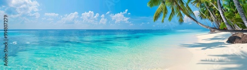 Palm-fringed beach with clear skies, serene and peaceful, tropical holiday resort