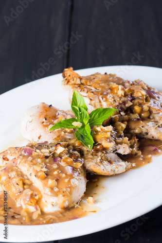 breast, chicken, cold, delicious, diet, dinner, food, fresh, fried, epicure, healthy, ingredient, lifestyle, light, lunch, meal, meat, nourishment, oil, orange, oriental, pan, paprika, plate, eatery, salad, sauce, scorching, sweet, tasty, thigh, traditional, turkey, walnut