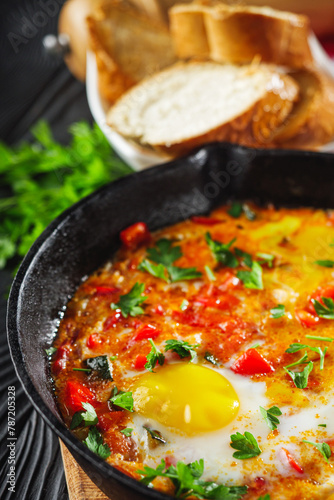 pan of delicious traditional israeli shakshuka on black wooden rustic background