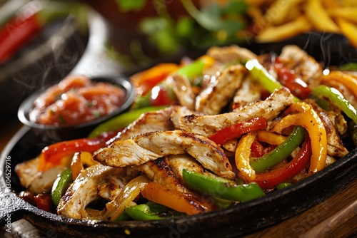 Pan of sizzling chicken fajitas with fresh vegetables and salsa on a wooden table