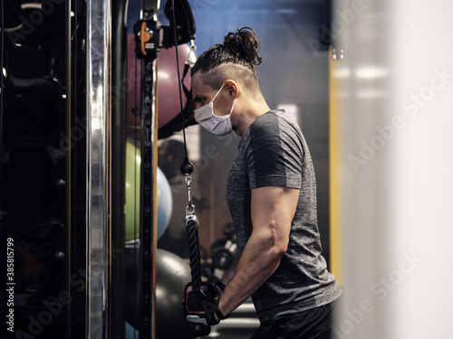 Pandemic gym - man working out with protective face mask during coronavirus outbreak