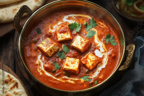 Paneer Butter Masala in Brass Bowl/ Kadhai with Butter Naan in Rustic Style