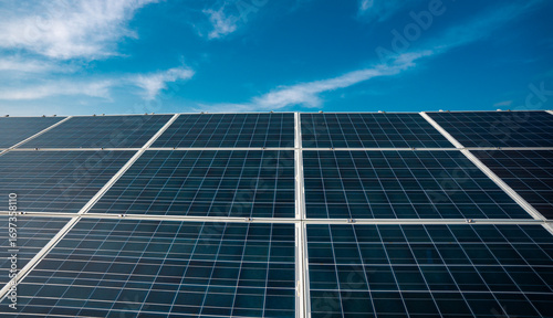 Panel panels on blue sky background. Solar solutions for green living. Power from solar is renewable. Solar panel and sun energy. Panel rows shine under the sun. Solar technology.