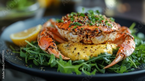 Panfried softshell crab served on a bed of arugula 293 food, meal, meat, dinner, chicken, dish, cuisine, plate, salad, fish, fried, vegetable, sauce, pork, delicious, grilled, gourmet, lunch, white,