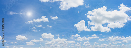 Panorama blue sky and clouds with sun and daylight natural background.