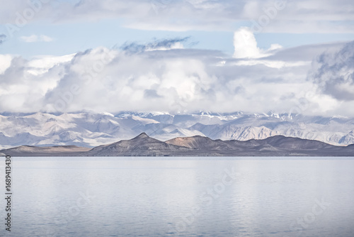 Panorama landscape of Lake Karakul in the Pamir mountains in the Tien Shan against the background of high snowy rocky peaks with clouds, morning panorama of the lake for the background