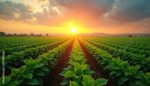 Panorama of green soybean plants on cultivated land at sunset. Gold sun, sky, clouds at background. Agriculture, farming concept. Summer, harvest, growth, nature. Successful agribusiness, organic eco