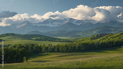 mountain, landscape, sky, nature, cloud, panorama, snow, vale, travel, alps, view, summer, peak, alpine, grass, cloud, mountain, green, forest, hill, field, tree, meadow, panoramic, countryside, rural, blue, horizon, sunny, vale