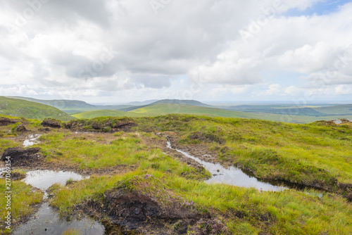 Panorama of mountains, marshy land and heathland of Connemara National Park in summer