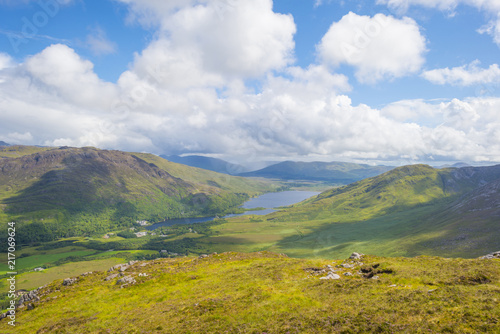 Panorama of mountains, marshy land and heathland of Connemara National Park in summer