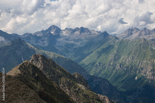 Panorama of mountains scene with dramatic cloudy sky in national park of Dombay