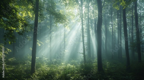 Panorama of Natural Beech Forest with Sunbeams through Morning Fog : Generative AI