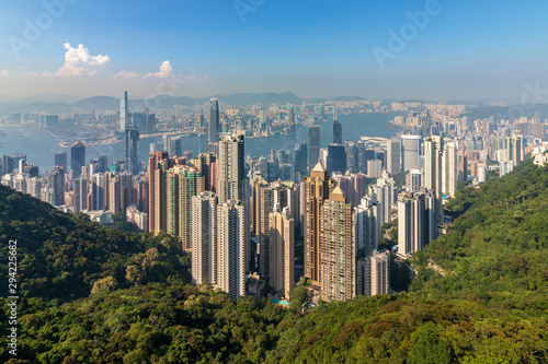 Panorama of Skyscrapers, Victoria Harbour and Hong Kong Bay. Taken from Victoria Peak Park on Hongkong Island. Hong Kong, China