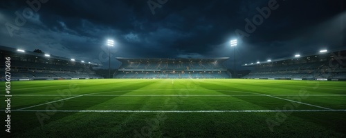 Panorama of soccer stadium at night with dramatic dark blue sky. Spotlights illuminate green grass field. Empty arena before soccer game. Perfect illustration for sport theme and championship event.