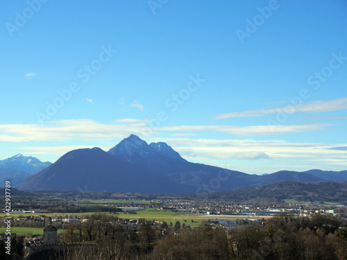 Panorama of the Austrian countryside near Salzburg .. Plains and mountains on a sunny day.