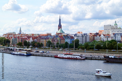 Panorama of the historical part of the city of Szczecin, the Odra River, on the pier of which there are ferries, ships, boats. Above the city a magnificent sunny sky with soft lush clouds