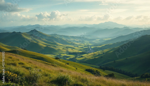 landscape, mountain, sky, nature, mountain, cloud, view, cloud, grass, hill, panorama, green, travel, vale, panoramic, tree, rock, tree, hill