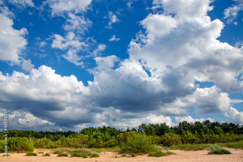 Panorama of the warm Gulf of Riga of the Baltic Sea against the background of cumulus clouds. The coast of the Gulf of Riga in Latvia is popular with tourists.