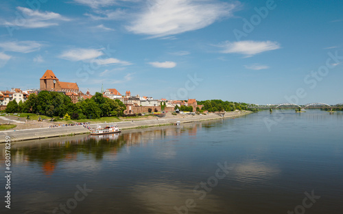 Panorama of Torun, old medieval town in Poland. Tourist boats on Vistula river with panorama of old town Torun in summer day.