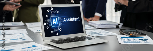 Panorama shot analyst team utilizing BI Fintech to analyze financial report with laptop. Businesspeople analyzing BI data dashboard displayed on laptop screen for business insight. Prodigy