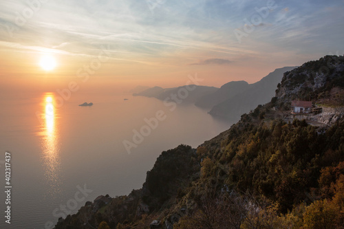 Panorama view of the Amalfi coast seen from the path of the gods at sunset, Campania, Southern Italy.