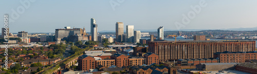 Panoramic aerial image of Liverpool cityscape featuring famous city landmarks.